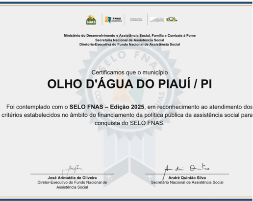 A Prefeitura Municipal de Olho d’Água do Piauí celebra mais uma importante conquista para o município: o reconhecimento com o Selo FNAS – Edição 2025, certificação concedida pelo Governo Federal que atesta o cumprimento dos critérios de financiamento e gestão da política pública de assistência social.