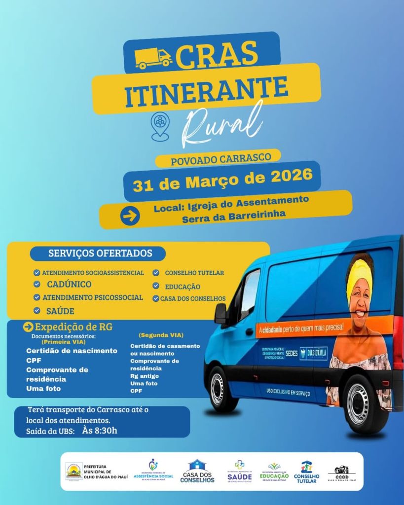 A Prefeitura Municipal de Olho D’Água do Piauí, por meio da Secretaria Municipal de Assistência Social, convida toda a população para participar do CRAS Itinerante Rural, que será realizado no dia 31 de março de 2026, no Povoado Carrasco, com atendimentos na Igreja do Assentamento Serra da Barreirinha.
