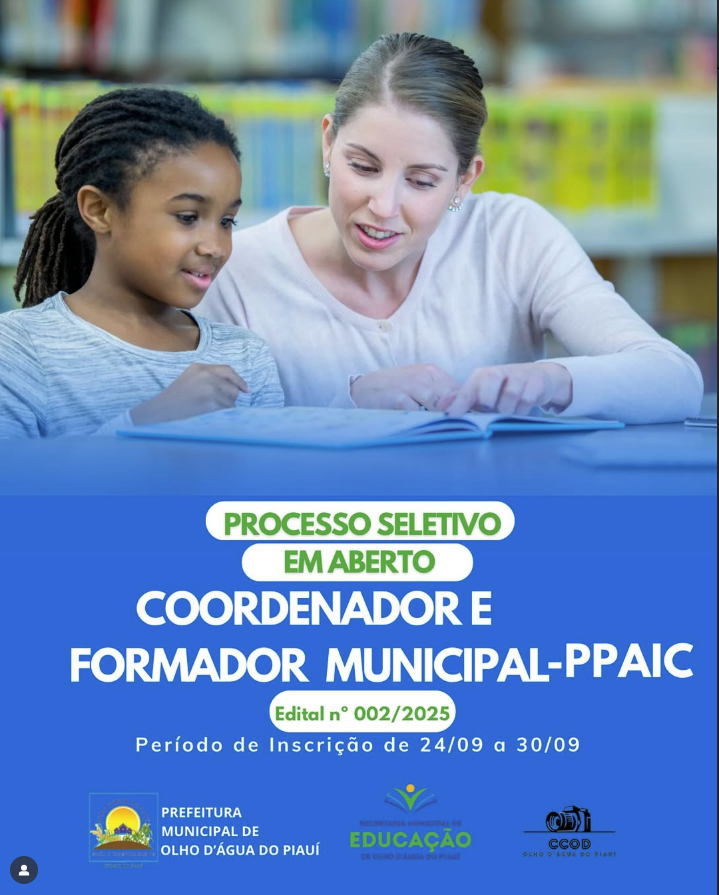 A Prefeitura Municipal de Olho D’Água do Piauí, por meio da Secretaria Municipal de Educação, torna público o Edital nº 002/2025, referente ao processo seletivo para os cargos de Coordenador Municipal (Nível IV) e Formador Municipal (Nível V) do Programa Piauiense de Alfabetização na Idade Certa (PPAIC).