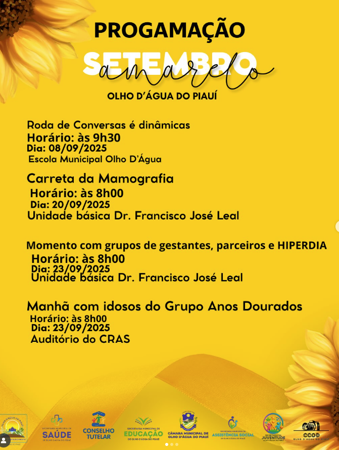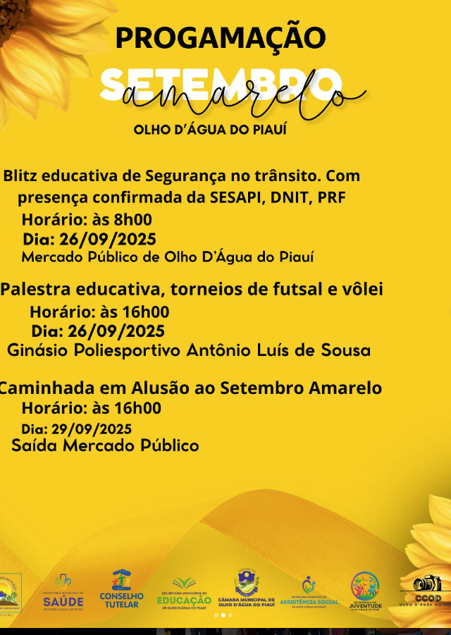 A Prefeitura Municipal de Olho D’Água do Piauí, em parceria com as Secretarias de Saúde, Assistência Social, Educação, Juventude, o Conselho Tutelar e a Câmara Municipal, preparou uma programação especial para marcar o Setembro Amarelo, campanha nacional de prevenção ao suicídio.